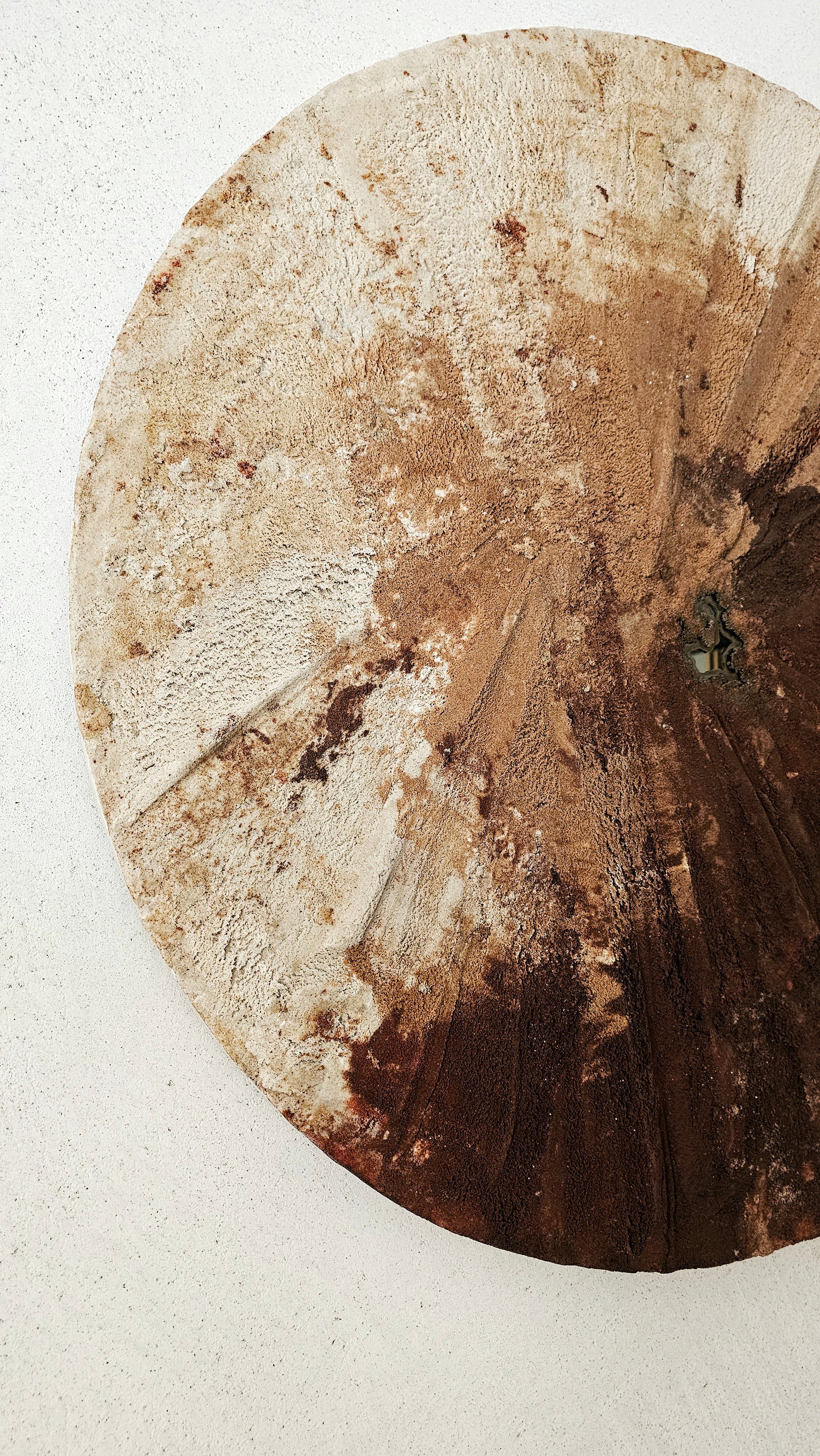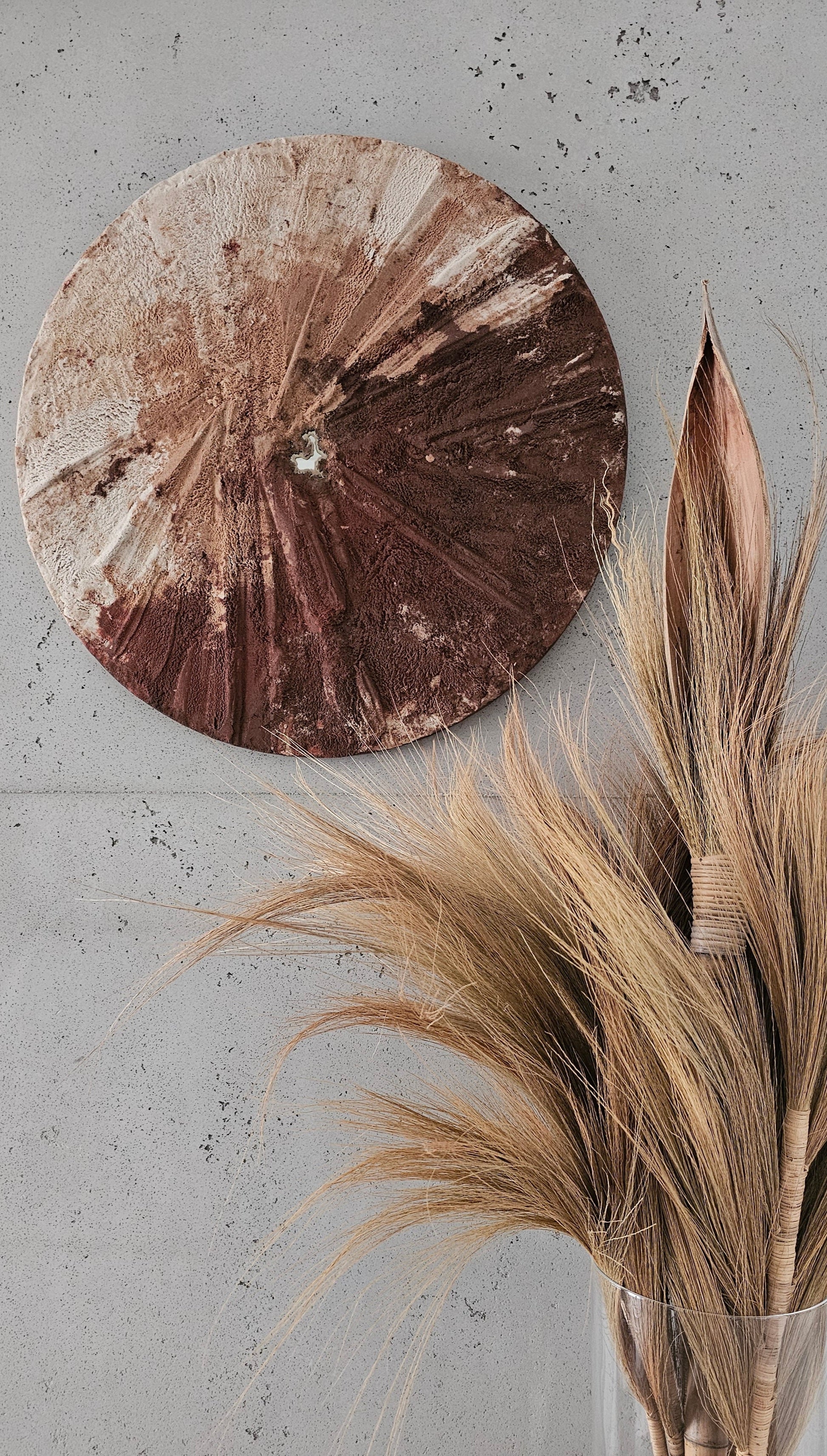 Die raue, fast kraterartige Textur erinnert an die Oberfläche des Mondes. Im Zentrum - ein Spiegelfragment, das wie ein leuchtender Kern erscheint: reduziert, klar, strahlend - wie ein stiller Mond reflektiert er das Licht und den Blick zurück auf den Betrachter. Ein Symbol für Ursprung, Stille und kosmische Bewegung.